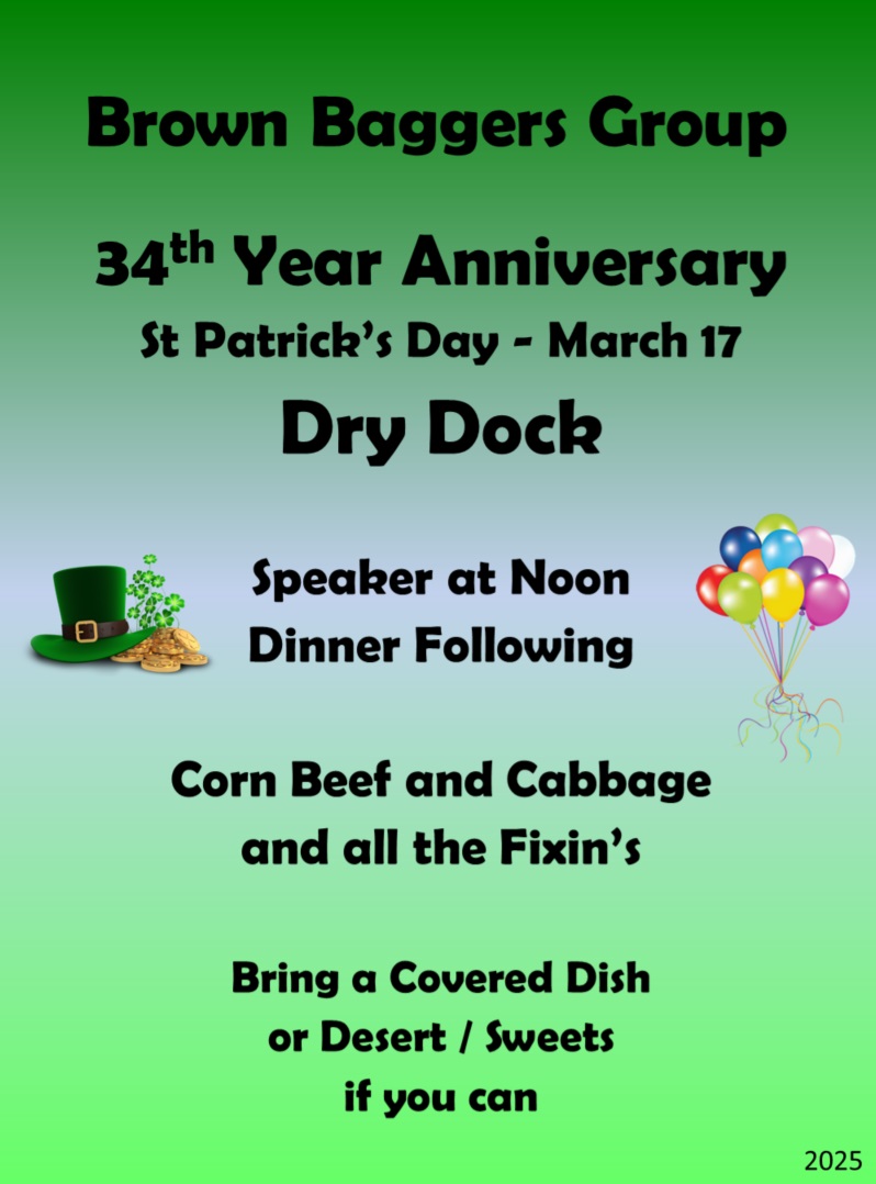 Friday March 17, noon – 4pm Meeting at noon, meal at 1pm Corned beef and cabbage, etc. Everyone welcome |