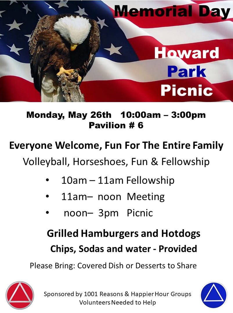 Monday May 29, … 10am -noon Fellowship noon – 1pm Meeting 1pm – 3pm Picnic Hamburgers & hotdogs provided Please bring: snacks, soda, deserts; to share Everyone welcome |